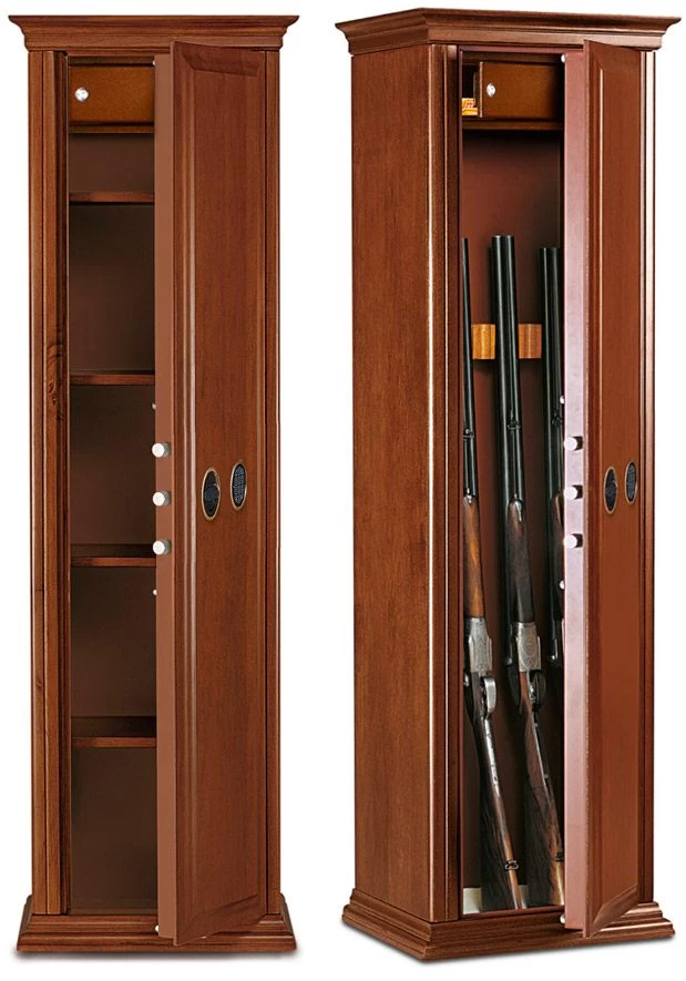Элитный сейф итальянского производства с натуральной деревянной отделкой. Этот сейф имеет двойное назначение – он предоставляет возможность комфортного содержания гладкоствольного и нарезного оружия или же ценных вещей и документов: сейф легко трансформируется из оружейного сейфа в сейф для ценностей при установке деревянных полок, входящих в комплект.